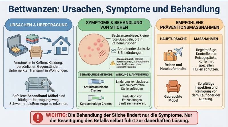 Wichtig: Die Behandlung der Stiche lindert nur die Symptome. Nur die Beseitigung des Befalls selbst führt zur dauerhaften Lösung.